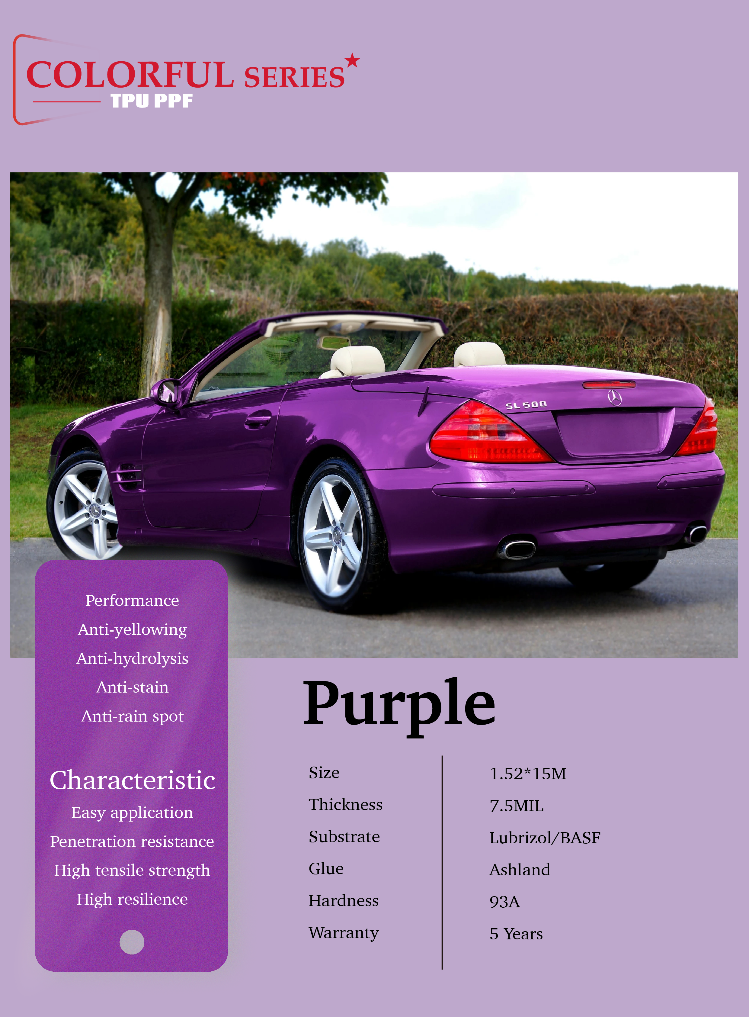 Excellent protective performance: Purple TPU film still inherits the high wear resistance, anti-ultraviolet and self-healing functions of TPU materials. It can protect the car paint while reducing damage to the car body from external scratches and ultraviolet rays.